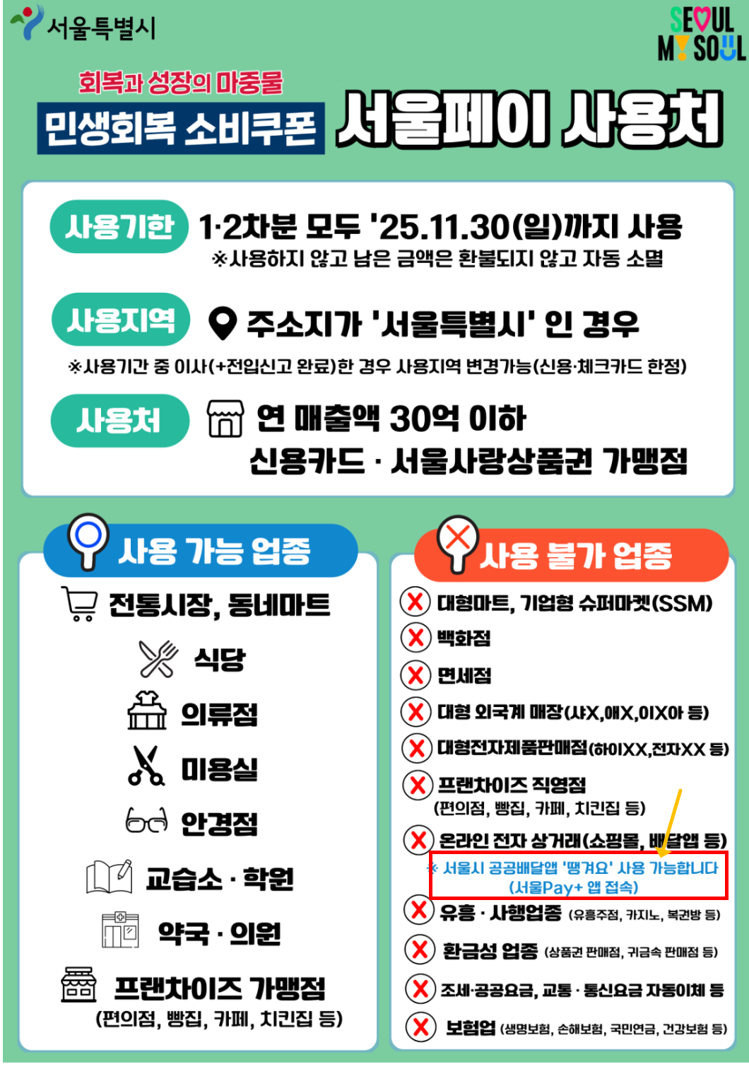 서울사랑상품권 소비쿠폰은 공공배달앱에서만 사용이 가능하며, 민간 배달앱(배민, 쿠팡이츠, 요기요 등)은 사용 불가합니다.