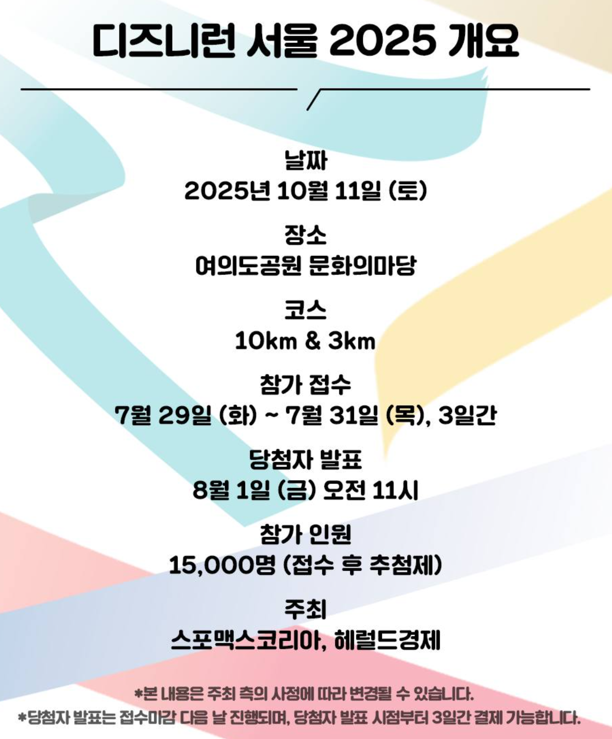 2025년 10월 11일, 서울 여의도공원 문화의마당에서 열리는 디즈니런 서울 2025! 디즈니 캐릭터들과 함께 달리는 이 특별한 러닝 페스티벌은 참가자들에게 마법 같은 하루를 선사할 예정입니다.하