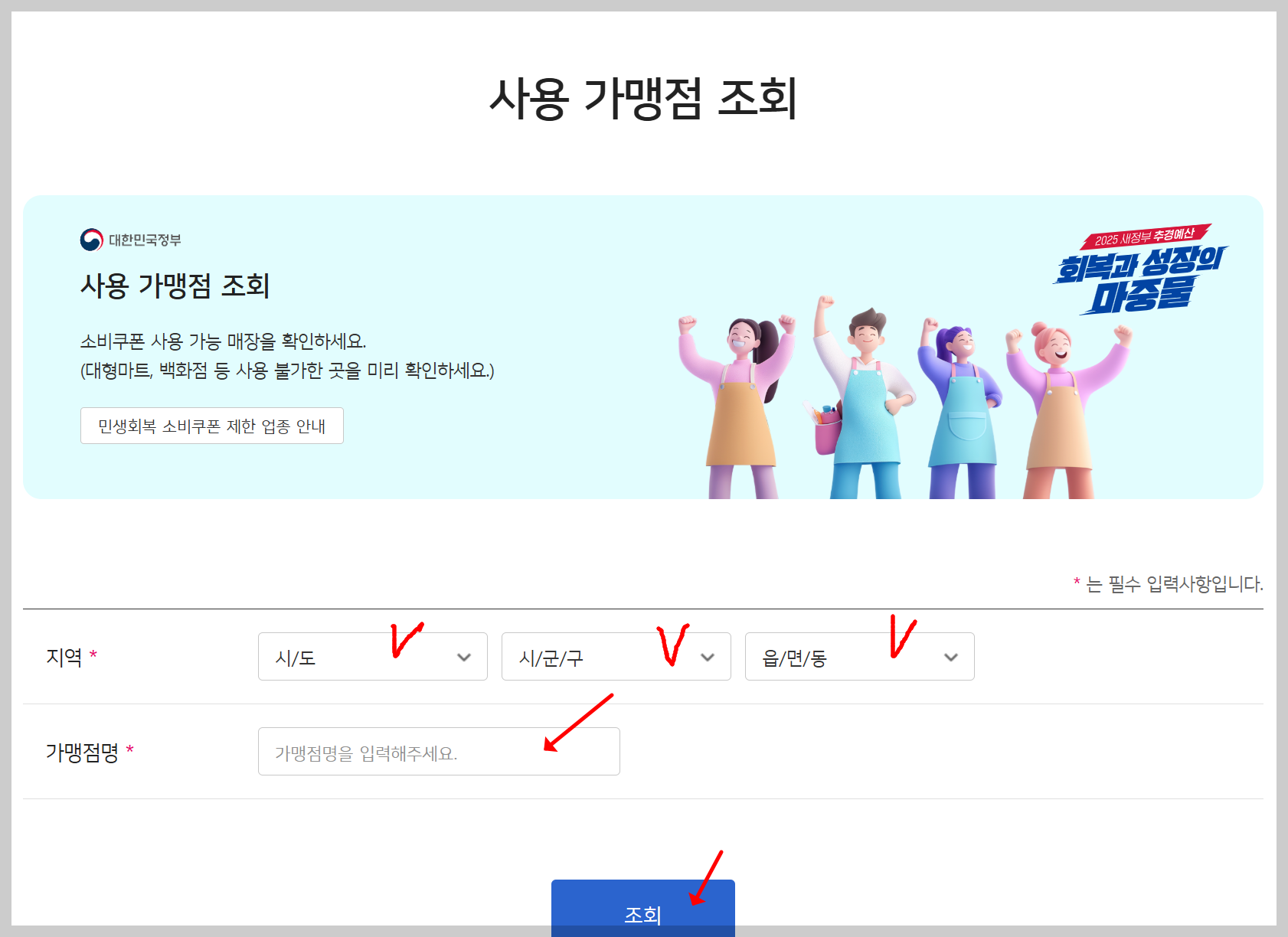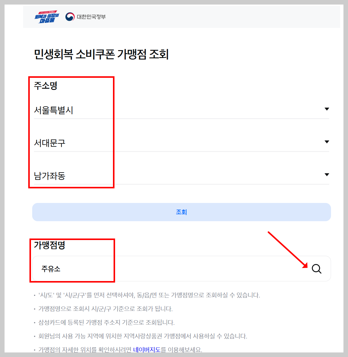 ✔ 지역(시/도 → 시/군/구)을 선택하고 가맹점 명을 검색하면