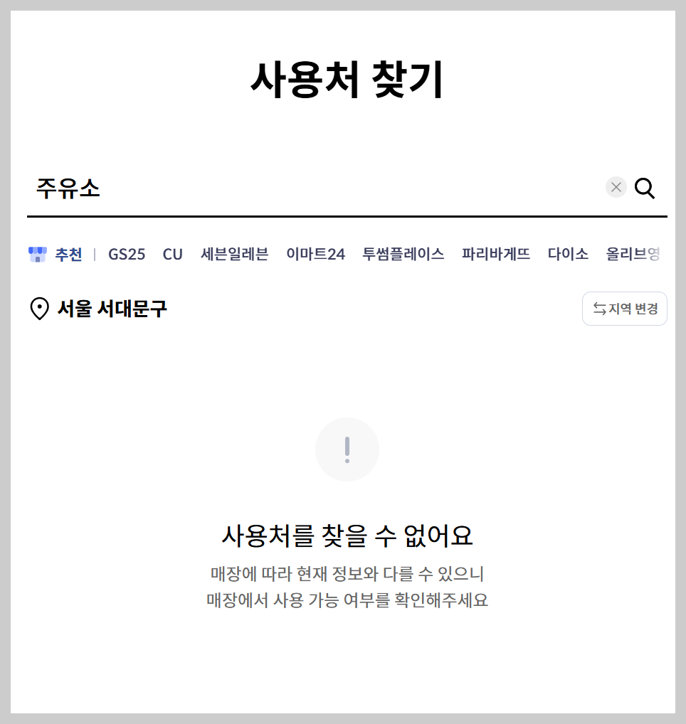 해당 지역에서 사용 가능한 가맹점 리스트가 나옵니다.