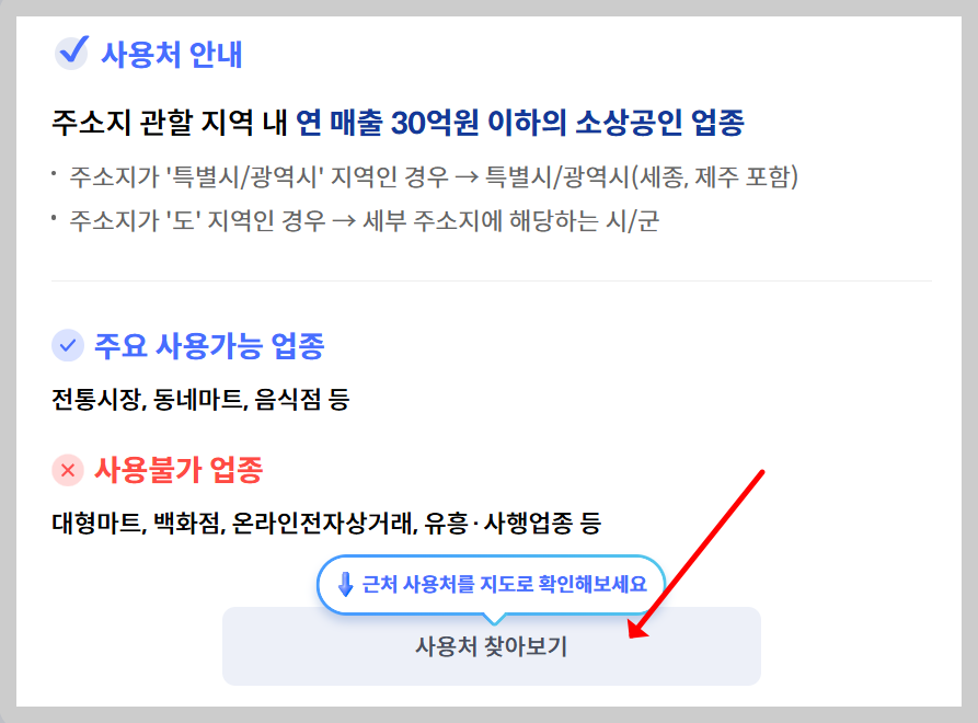 - ✅ 사용 가능: 전통시장, 동네마트, 음식점, 약국, 학원, 미용실, 안경점, 프랜차이즈 매장 등 (연매출 30억 원 이하)
