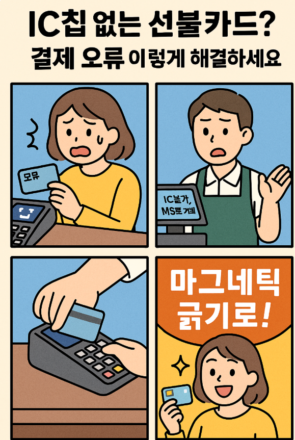 - POS기에서 자동으로 “IC 불가, MS로 거래하세요” 메시지가 뜨며,