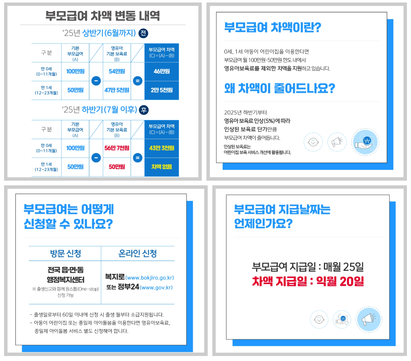 특히 2025년 7월 보육료 인상으로 인해 8월부터 부모급여 차액이 변동되니, 어린이집을 이용하는 가정은 지급액 변화를 꼭 확인하세요.