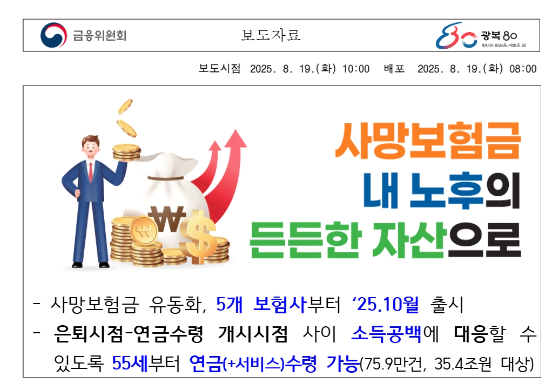 2025년 10월부터, 만 55세 이상은 사망보험금을 연금처럼 선지급 받을 수 있는 제도가 시행됩니다. 이 제도는 은퇴 이후 소득공백을 메우기 위한 목적으로 도입된 사망보험금 유동화 제도입니다.