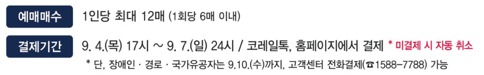 - 교통약자 예매 승차권: 9월 10일(수)까지 결제