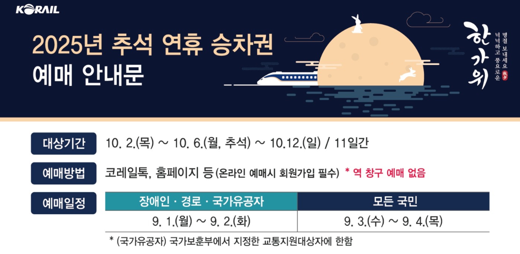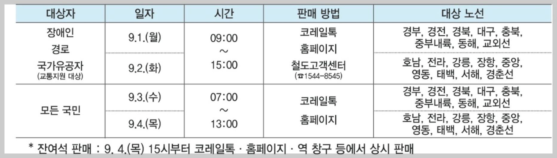 - 교통약자 예매 승차권: 9월 10일(수)까지 결제