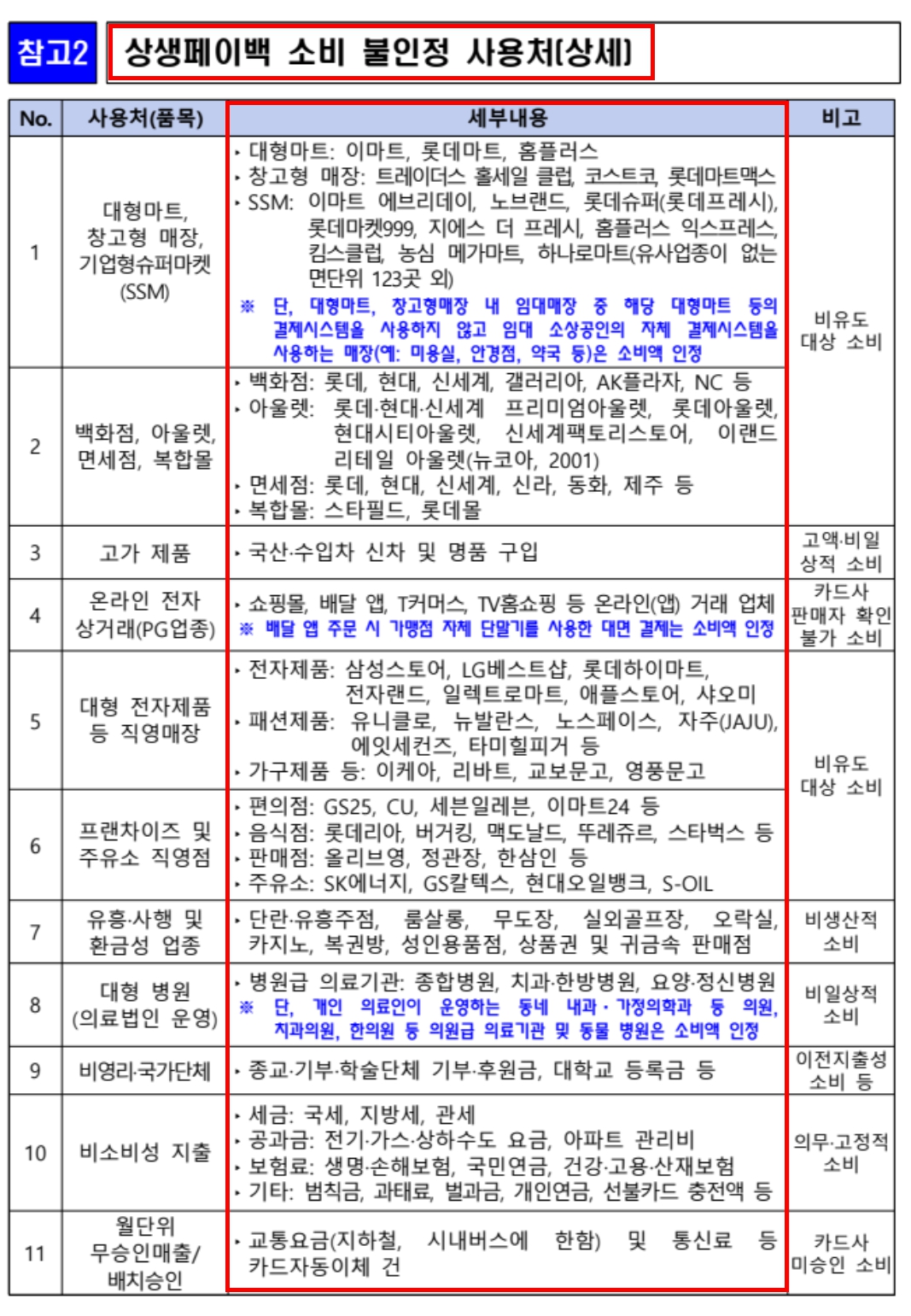 이러한 사용처들은 상생페이백 실적에 모두 포함되지 않습니다.