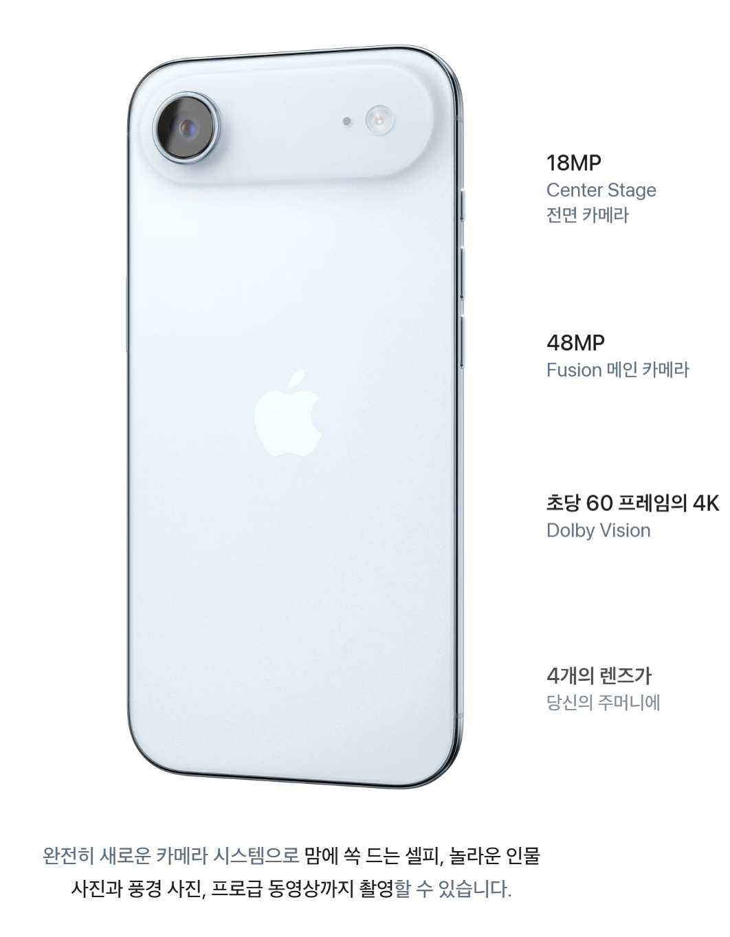 에어는 이번에 새로 추가된 모델로, 기존 아이폰과는 느낌이 완전히 다릅니다. 가볍고 고급스럽지만 성능도 준프로급!