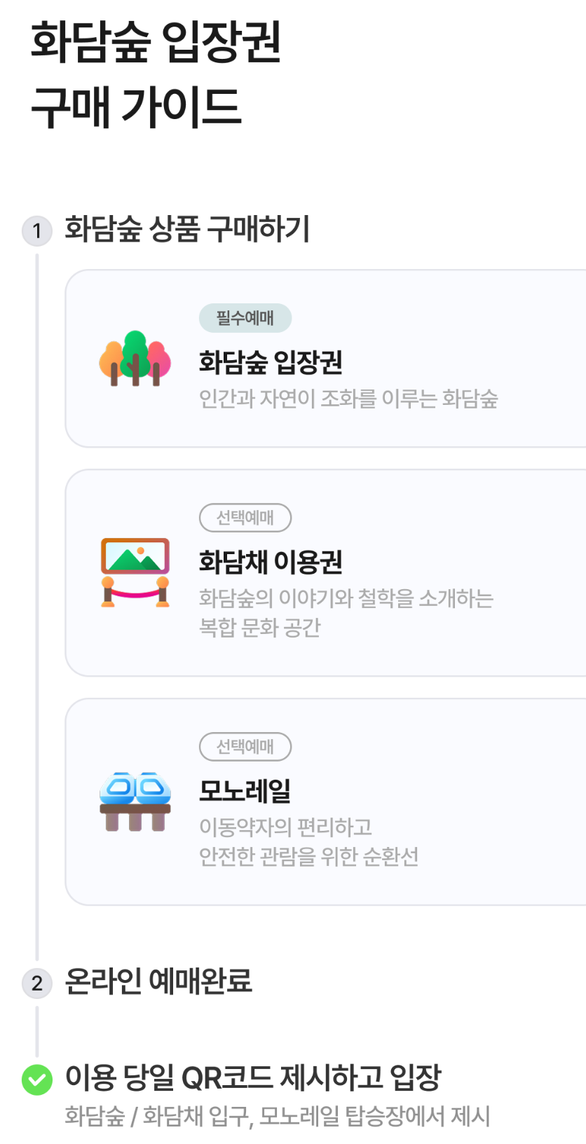 - 날짜 및 시간 선택 → 인원 선택 → 상품(입장권, 모노레일 등) 선택