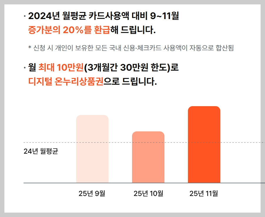 | 환급 조건 | 2025년 9~11월 사용액이 2024년 월평균보다 많을 경우, 증가분의 20% 환급 |