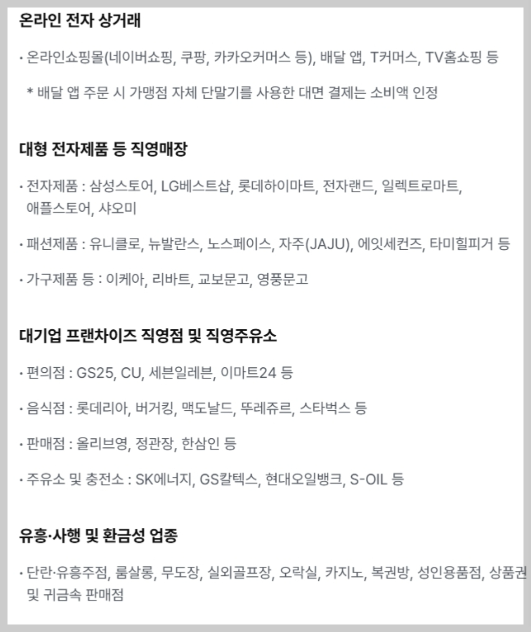 특히 이번 상생페이백은 백화점, 대형마트, 온라인쇼핑몰 등 제외되는 곳이 많기 때문에 반드시 조건을 확인하고 사용하셔야 환급 대상이 됩니다.