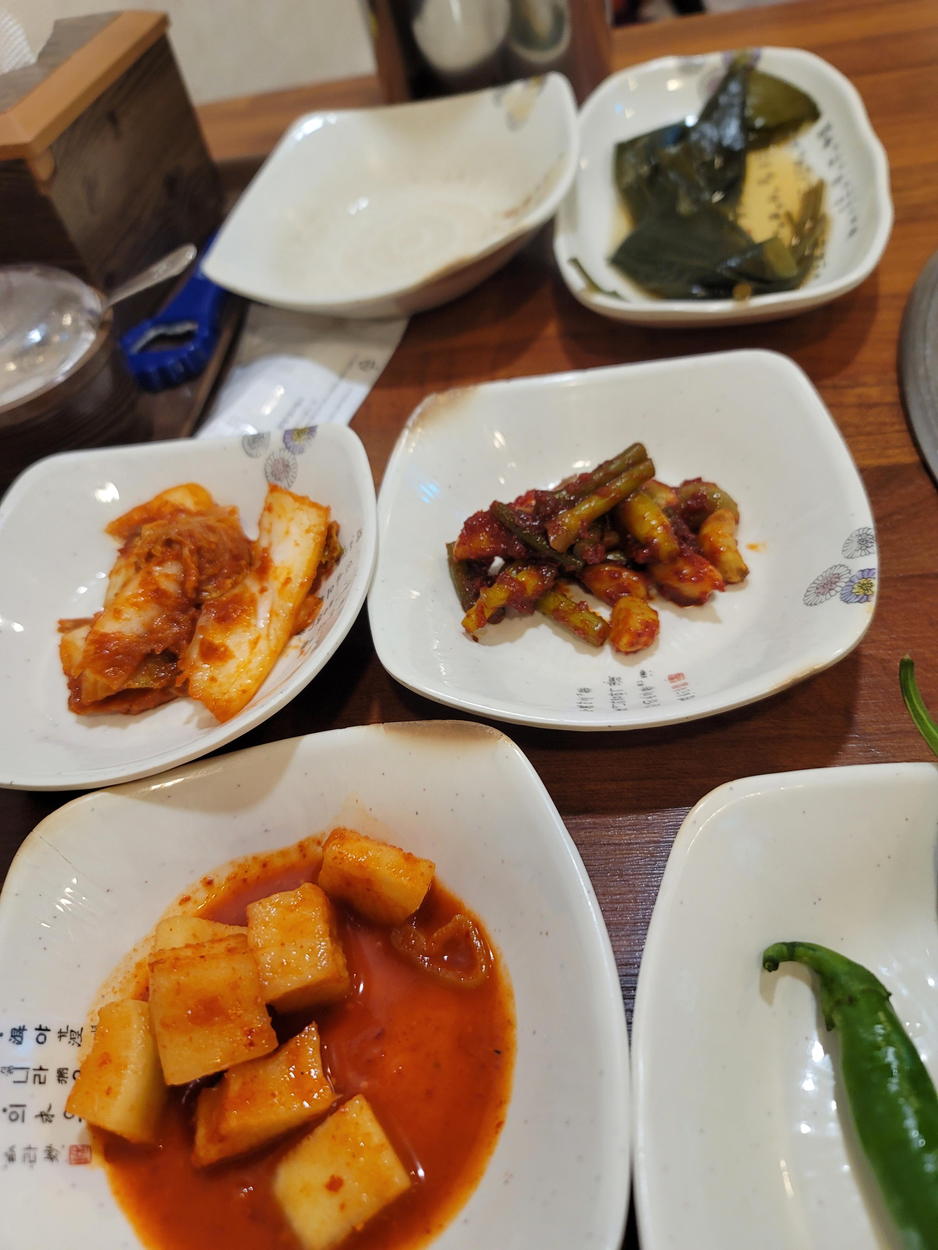 백숙에 나오는 기본 반찬들이고 셀프바에서 리필할 수 있어요
